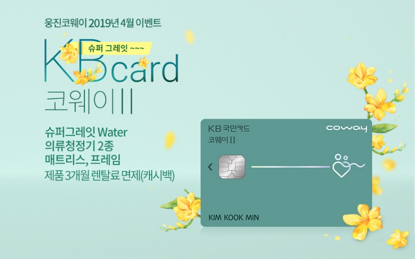 [KB국민카드 코웨이 II 카드] 제품 3개월 렌탈료 면제(캐시백) 프모로션 2020-05-20 첨부파일 740018679_9Z1IUBNu_1.jpg : 83.63 M, [KB국민카드 코웨이 II 카드] 제품 3개월 렌탈료 면제(캐시백) 프모로션 코웨이 주요 고객사 생활의 코웨이, 지속적인 품질의 고급화와 기술력 혁신을 통하여 글로벌 기업으로서 비전을 실현해가고 있습니다. 1544-2045 고객님께 가장 알맞은 제품으로친절하게 상담드리겠습니다.