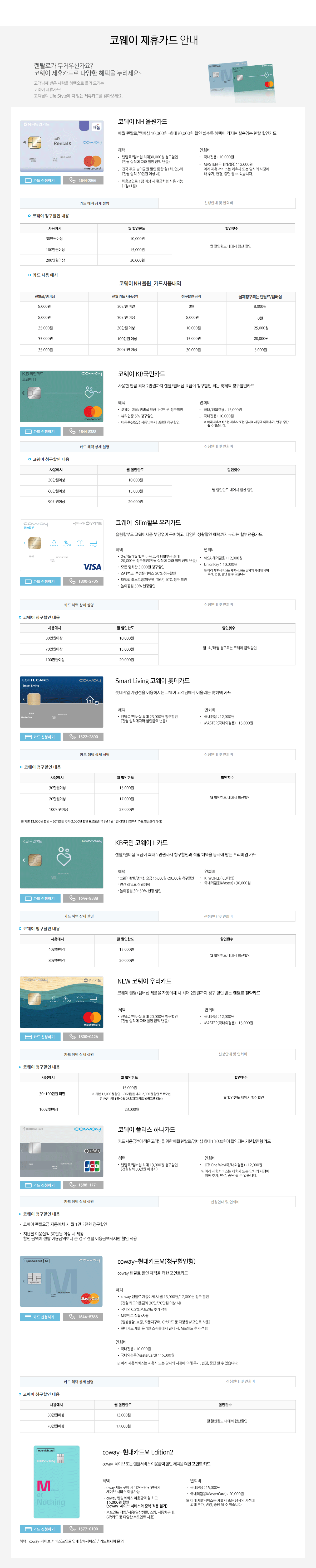 코웨이 제휴카드안내 2020-05-20 첨부파일 card.gif : 407.75 M, 코웨이 주요 고객사 생활의 코웨이, 지속적인 품질의 고급화와 기술력 혁신을 통하여 글로벌 기업으로서 비전을 실현해가고 있습니다. 1544-2045 고객님께 가장 알맞은 제품으로친절하게 상담드리겠습니다.