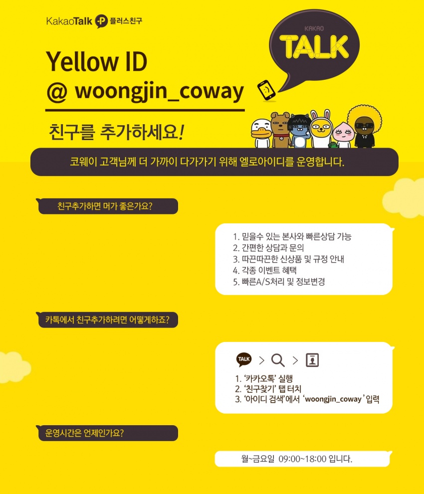 코웨이 카카오톡 옐로우아이디 오픈 2020-05-20 첨부파일 kakao_page.jpg : 170.41 M, 많은 이용 바랍니다. 코웨이 주요 고객사 생활의 코웨이, 지속적인 품질의 고급화와 기술력 혁신을 통하여 글로벌 기업으로서 비전을 실현해가고 있습니다. 1544-2045 고객님께 가장 알맞은 제품으로친절하게 상담드리겠습니다.