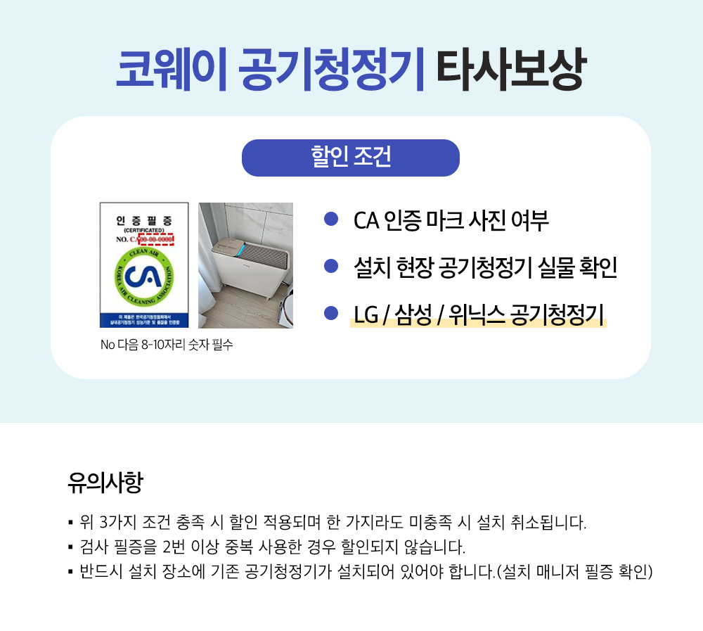 ▶ 정수기 타사보상 *기존제품* 1.브랜드 2.설치일 (제조년월도 무관) 3.스탠드or데스크탑 4.얼음or냉온 5.수조형or직수형 6. KC 물마크번호(필수) > 설치시 접수물마크번호와 동일한 제품 현장에 필 ▶ 청정기 타사보상 1. LG, 삼성,위닉스 청정기만 적용 2. CA필증번호 > 현장 설치시 동일여부확인 |