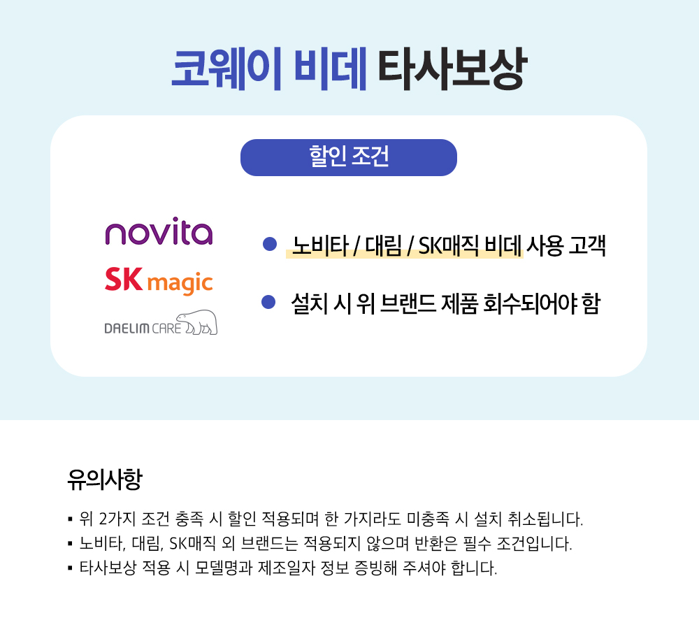 | 타사보상 필요서류 | ▶ 정수기 타사보상 *기존제품* 1.브랜드 2.설치일 (제조년월도 무관) 3.스탠드or데스크탑 4.얼음or냉온 5.수조형or직수형 6. KC 물마크번호(필수) > 설치시 접수물마크번호와 동일한 제품 현장에 필 ▶ 청정기 타사보상 1. LG, 삼성, 위닉스 청정기만 적용 2. CA필증번호 > 현장 설치시 동일여부확인 |