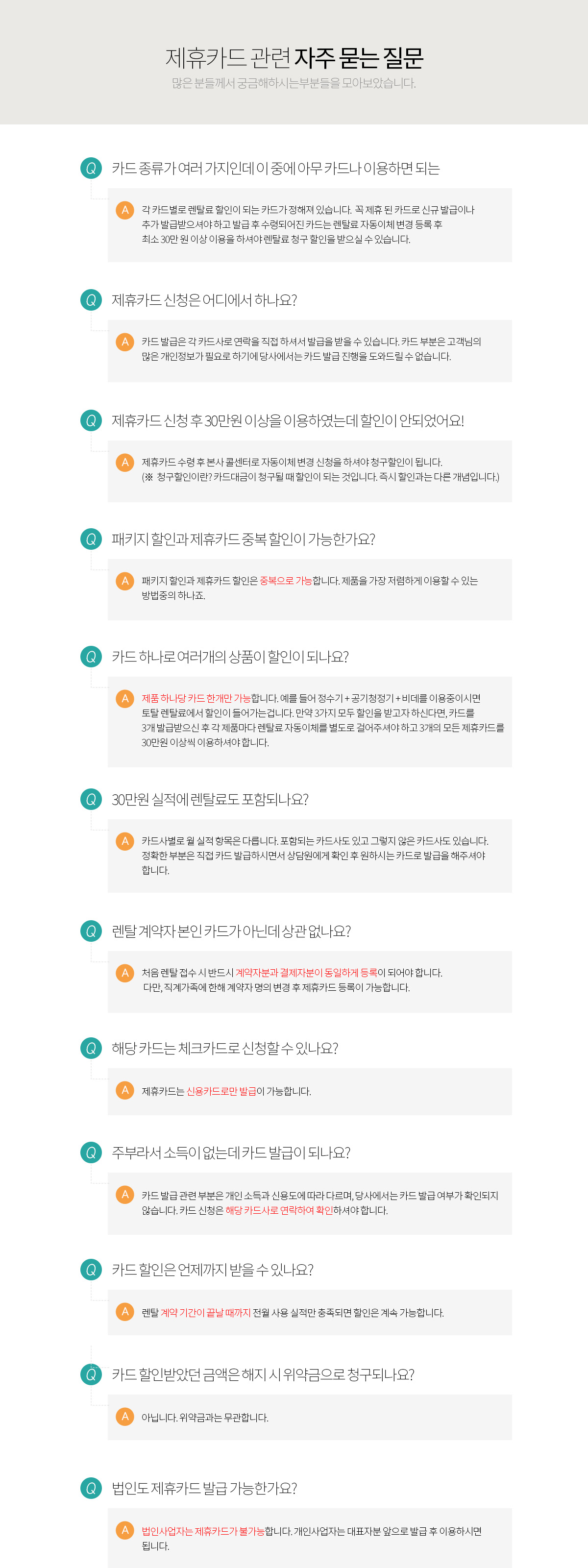 ㆍ 조건 : 코웨이 제품 사용고객 중 전월실적 30만원 이상(자동이체 필수) ㆍ 사용 금액에 따라 렌탈/멤버십/자체무이자 매월 청구할인 ㆍ전월실적 제외대상 - 취소매출, 단기카드대출, 장기카드대출, 연회비, 제세공과금(국세/지방세/도시가스/사회보험/공공요금 등) 아파트관리비, 대학등록금, 상품권(선불카드 포함)구입 및 충전, 교통카드 이용금액, 초,중,고 학부모 부담금은 제외 각종 간편결제(*삼성페이, 카카오페이, 네이버페이, 페이코 등)를 통해 결제되는 경우 할인적용 제외 ㆍ 연회비 : 국내전용 12,000원 / UnionPay 15,000원 / Master 15,000원 |